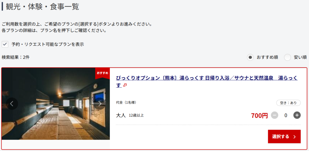 JALダイナミックパッケージを利用し、びっくりオプションを使うことでサウナ施設をお得に利用することができました。